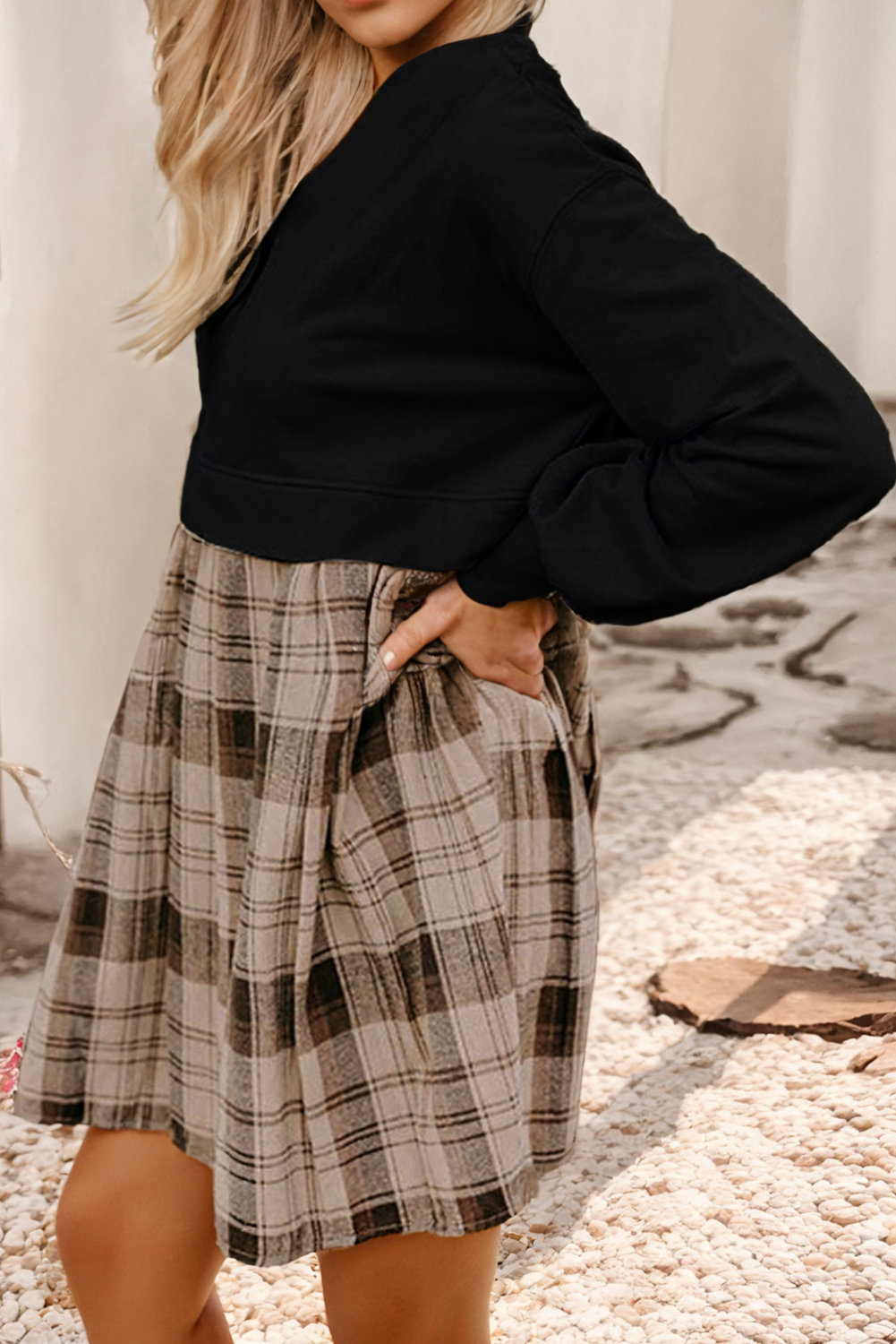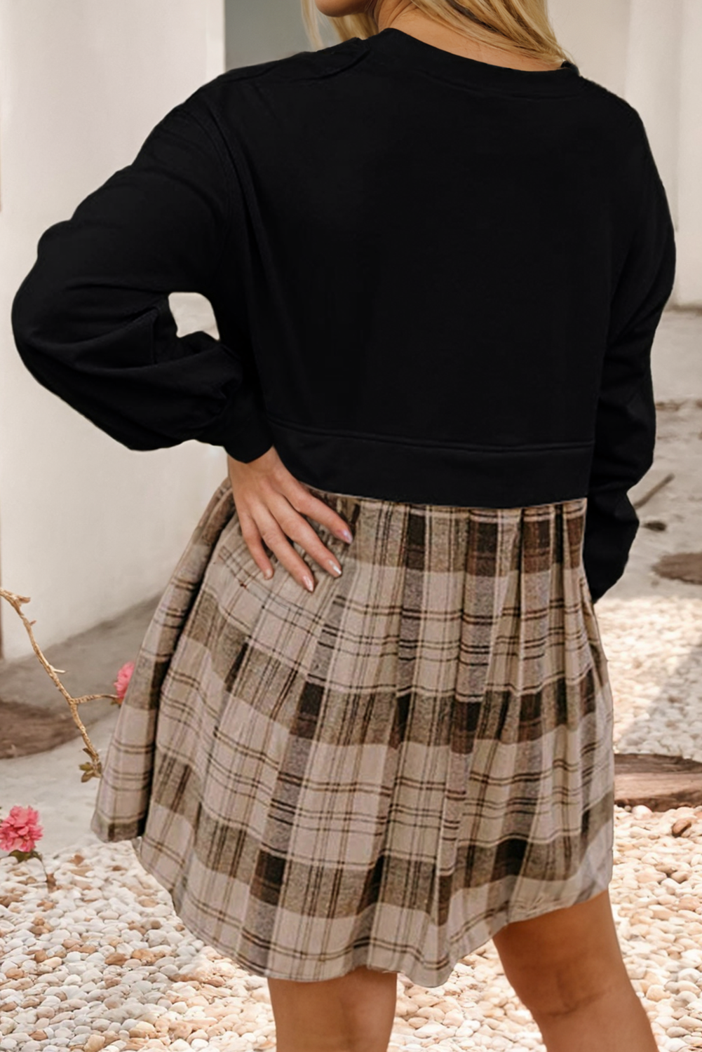 LDC Plaid Patchwork High Waist Sweatshirt Mini Dress