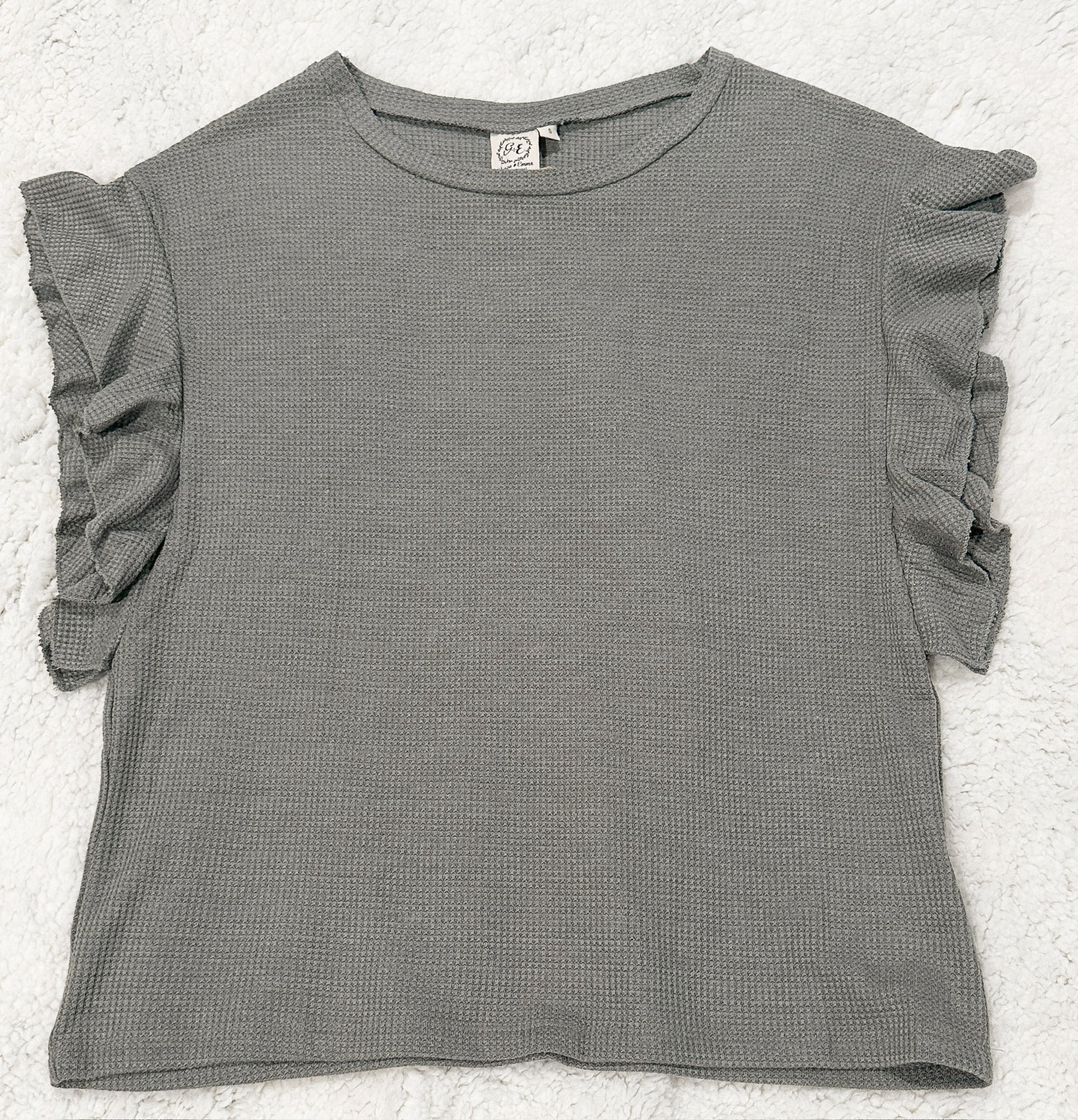 Olive waffle top with ruffled sleeves. If you wan to dress up or down, this is a great option!